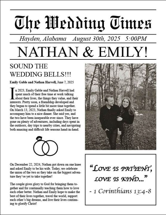 This project required us to create a two-page spread that pushed us to learn how to use necessary tools and skills in Adobe InDesign. Because I was planning on getting married (our plans changed due to deaths in the family), I decided this was the perfect time to try out a trend that I loved - wedding newspaper programs. I also had a little bit of experience designing newspapers because I worked on my high school newspaper staff, so I knew this would be fun.